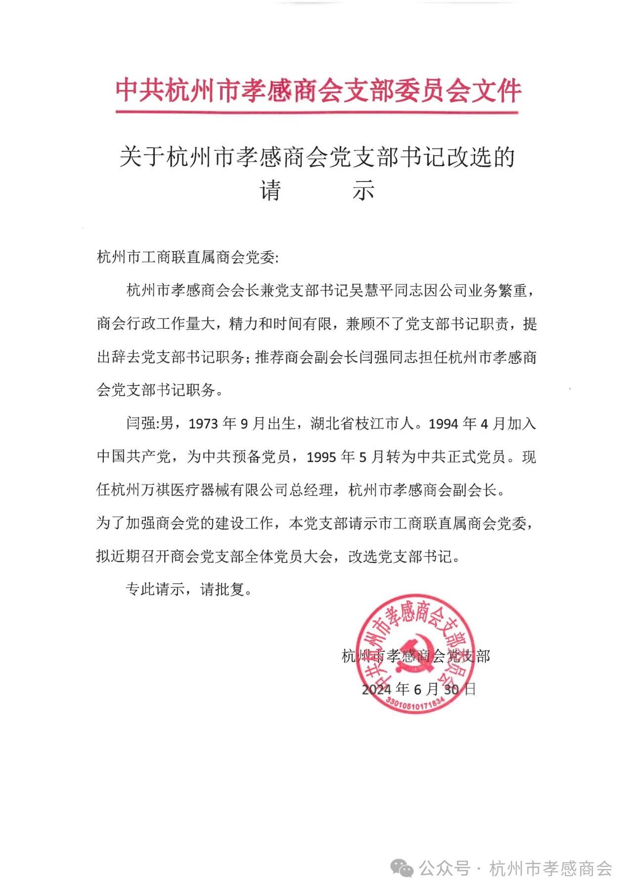 此次党支部书记改选大会应到党员6名,实到4名,符合《党章》和《中共杭州市基层党组织负责人公推直选暂行办法》的要求。原任党支部书记吴慧平同志书面作了述职工作报告,并向大会作了辞去党支部书记的书面请求:由于自已担任商会会长职务,商会行政工作和自身企业的发展很难兼顾做好党支部的工作,也不利于党组织对商会行政工作的监督,辞去党支部书记职务更有利于本商会“党建带会建,会建促党建”工作。并提议推荐本商会副会长闫强同志担任商会党支部书记。经过选举大会的严格程序,最后,闫强同志全票当选杭州市孝感商会党支部书记。
