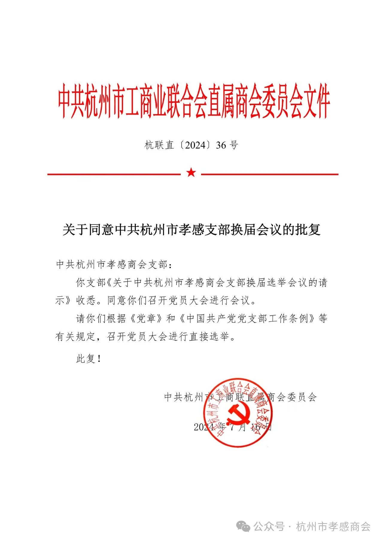 7月31日,杭州市孝感商会党支部在商会大会议室召开全体党员大会,举行党支部书记改选。会议由浙江省湖北商会党委第一支部书记、杭州市孝感商会秘书长高健同志主持,杭州市工商联直属商会党委委派党建联络员、浙江省湖北商会党委办公室主任刘华同志参加会议。